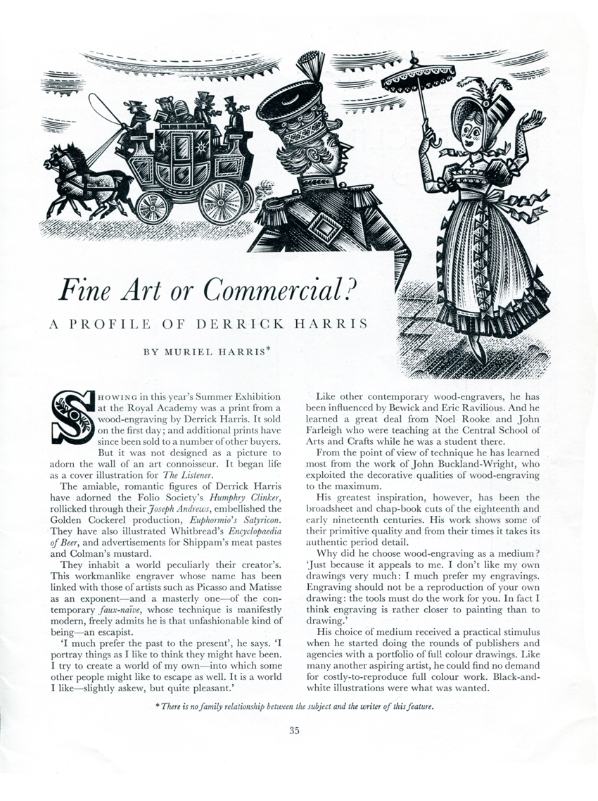 The amiable, romantic figures of Derrick Harris have adorned the Folio Society’sHumphrey Clinker, rollicked through their Joseph Andrews, and embellished the Golden Cockerel production, Euphormio’s Satyricon. They have also illustrated Whitbread’s Encyclopaedia of Beer, and advertisements for Shippam’s meat pastes and Colman’s mustard.